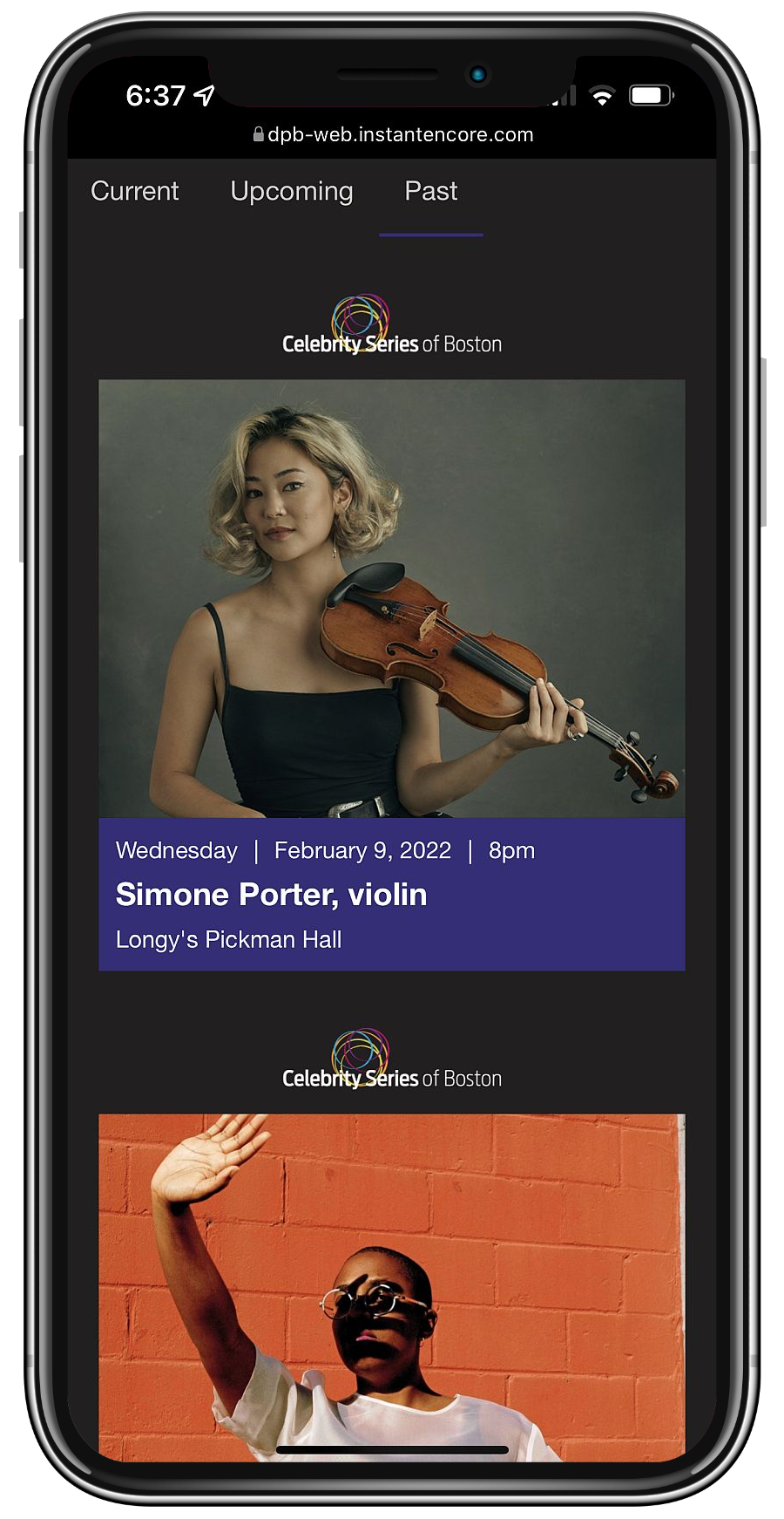Example: Celebrity Series of Boston's patrons can access digital programs for prior performances by going to the Past tab on the theatre's Published Programs page.